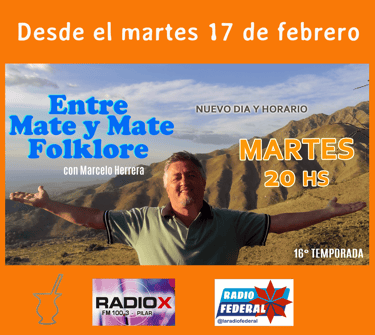 Entre Mate y Mate Folklore, es nuestro programa insignia. Declarado de interés cultural en la ciudad de Pilar, desde hace catorce temporadas difunde nuestra cultura y sus artistas. En el año 2016 fue declarado mejor programa de música folklorica de la provincia de Buenos Aires, ganando el premio Caduceo, en la ciudad de La Plata. Cada domingo se enciende un imaginario fogón para que la ronda matera más grande del mundo se reúna a compartir nuestra cultura.